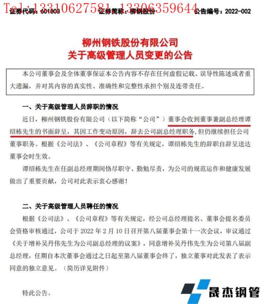 2月10日,柳州鋼鐵股份有限公司發(fā)布關(guān)于高級管理人員變更的公告。公告顯示,柳鋼股份董事會收到董事兼副總經(jīng)理譚紹棟的書面辭呈,其因工作變動原因,辭去柳鋼股份副總經(jīng)理職務,但仍繼續(xù)擔任柳鋼股份董事職務。