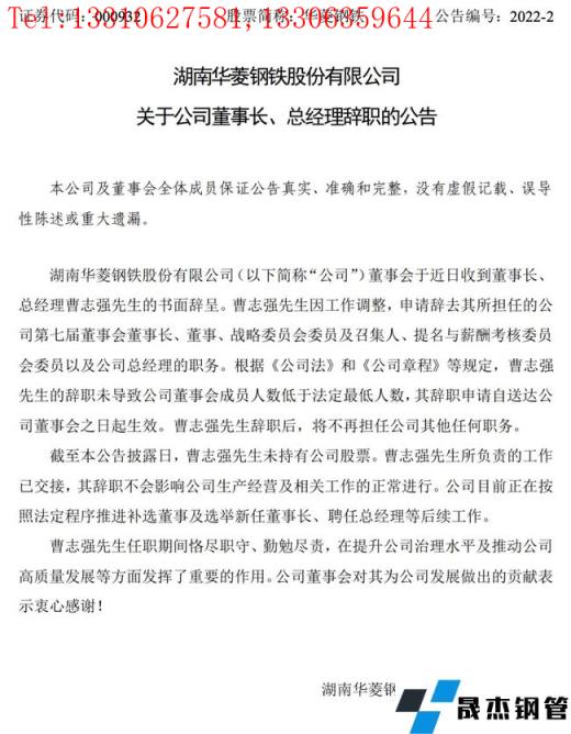 日前,湖南華菱鋼鐵股份有限公司發(fā)布公告稱,公司董事會于近日收到董事長、總經(jīng)理曹志強的書面辭呈。曹志強因工作調(diào)整,申請辭去其所擔任的公司第七屆董事會董事長、董事、戰(zhàn)略委員會委員及召集人、提名與薪酬考核委員會委員以及公司總經(jīng)理的職務。