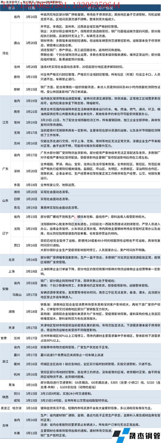好像是一夜之間,疫情再次卷土重來。截至3月21日,16個(gè)省份停工復(fù)工情況見下表。其中,3月21日,南京全市范圍內(nèi)除保障市民生活和城市基本運(yùn)行的水、電、燃油、燃?xì)狻⑼ㄐ拧h(huán)衛(wèi)、糧油肉菜供應(yīng)等公共服務(wù)類企事業(yè)單位外,其他有條件的單位盡可能安排居家辦公。3月20日,唐山開平區(qū)、豐南區(qū)、灤州市、遷西縣全域?qū)嵤﹪?yán)格封控管理;大部分鋼企維持生產(chǎn),但政府實(shí)施道路管控,無縫鋼管廠家均面臨運(yùn)輸方面的問題。深圳全市福田、羅湖、南山、寶安、龍崗以及龍華暫未恢復(fù),全市封控區(qū)、管控區(qū)、防范區(qū)繼續(xù)嚴(yán)格執(zhí)行疫情防控相關(guān)措施。山東濰坊、日照、青島萊西市實(shí)現(xiàn)社會(huì)面動(dòng)態(tài)清零。河北滄州連續(xù)4天實(shí)現(xiàn)社會(huì)面動(dòng)態(tài)清零,3月20日起部分地區(qū)逐步解除封控。
