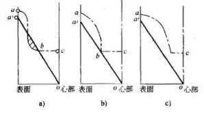 中點劃線表示半軸感應加熱淬火后的強度分布情況,a'o表示半軸的扭轉應力分布情況。若淬硬層太淺,則半軸強度不足,圖3a中b'b區域為危險區;若淬硬層太深,圖3c,則由于半軸表層殘留壓應力降低而降低疲勞壽命。合適的淬硬層深度應如圖3b所示。