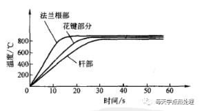 是帶法蘭的半軸采用矩形感應器整體一次感應加熱淬火時實際觀察的表面均溫加熱曲線。