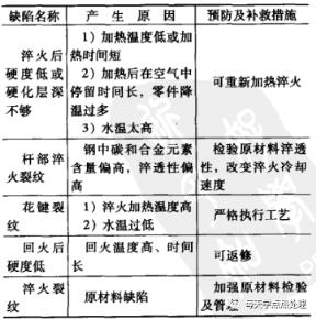半軸的常見熱處理缺陷及預防補救措施半軸調質的常見熱處理缺陷的預防及補救措施見表14。半軸表面感應加熱淬火的常見缺陷的預防及補救措施見表15。▼表14半軸調質的常見熱處理缺陷的預防及補救措施