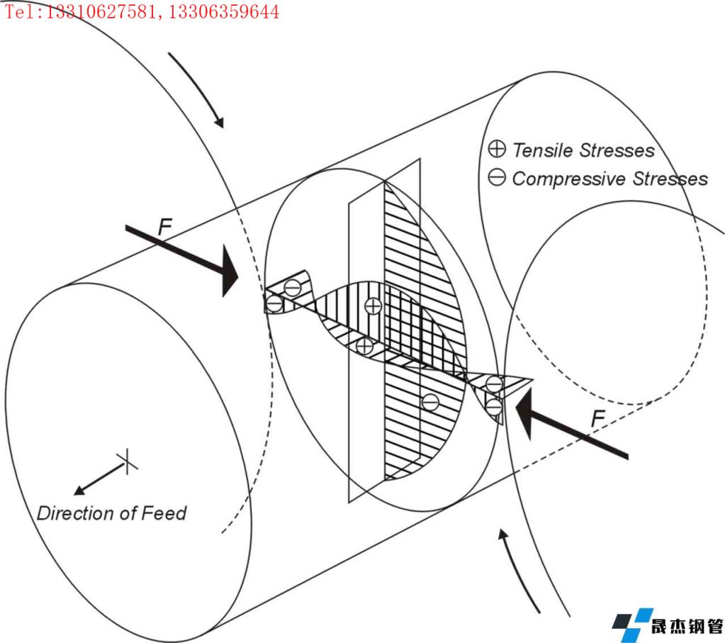 圖4-6顯示管坯的受力情況,圖中顯示F為軋輥方向(平面)的力,為壓應(yīng)力,在接觸點(diǎn)的位置顯示為最大。中心部位(導(dǎo)盤方向)顯示為拉應(yīng)力,理論上在導(dǎo)盤的中心部位受力為最大。因?yàn)楣芘鞯牟粩嘈D(zhuǎn),同一部位的受力情況不斷變化,導(dǎo)致中心部位的金屬受到交變應(yīng)力的作用,中心產(chǎn)生疏松,形成孔腔。