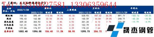 本周五大品種總庫存依然處于累庫趨勢,其中廠庫周環比增2.7%,月環比增3.6%,年同比降30.7%;社庫周環比增14.9%,月環比增27.6%,年同比減3.4%;總庫存周環比增11.2%,月環比增19.8%,年同比減13%。綜合來看,目前庫存累增幅度依舊略低于預期,本周社庫雖然大幅累增近157萬噸,但整體庫存水平依舊低于去年同期水平,主要原因在于2021年大面積執行能耗雙控,粗鋼及鋼材同比減量,使得入庫資源和市場流入資源大幅減量影響。綜合來看,春節需求停滯,庫存必然延續性累增,加之目前最強雨雪天氣襲來,碼頭、港口、陸路等卸貨均受阻,入庫節奏受限,因此節后增幅大概率比目前更加突出。