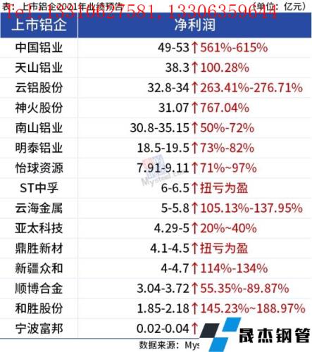 免責聲明:本網站(山東武鞍無縫鋼管廠www.97ks.net)刊載的“15家上市鋁企2021年業績飄紅,神火股份大增超7倍”等均源于網絡,版權歸原作者所有,且僅代表原作者觀點,本文所載信息僅供參考。轉載僅為學習與交流之目的,如無意中侵犯您的合法權益,請及時聯系刪除。本網站刊登此篇文章并不意味著本站贊同其觀點或證實其內容的真實性,我們不對其科學性、嚴肅性等作任何形式的保證。如果侵犯了您的版權,請盡快聯系我們予以撤銷,謝謝合作!