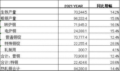 根據(jù)日本鋼鐵協(xié)會(huì)的統(tǒng)計(jì),2021年日本生鐵產(chǎn)量為7034萬噸,同比增長14.2%。粗鋼產(chǎn)出當(dāng)中,轉(zhuǎn)爐鋼產(chǎn)量為7194.5萬噸,同比提高16%,電爐鋼產(chǎn)量達(dá)2438.8萬噸,同比增長15.4%。