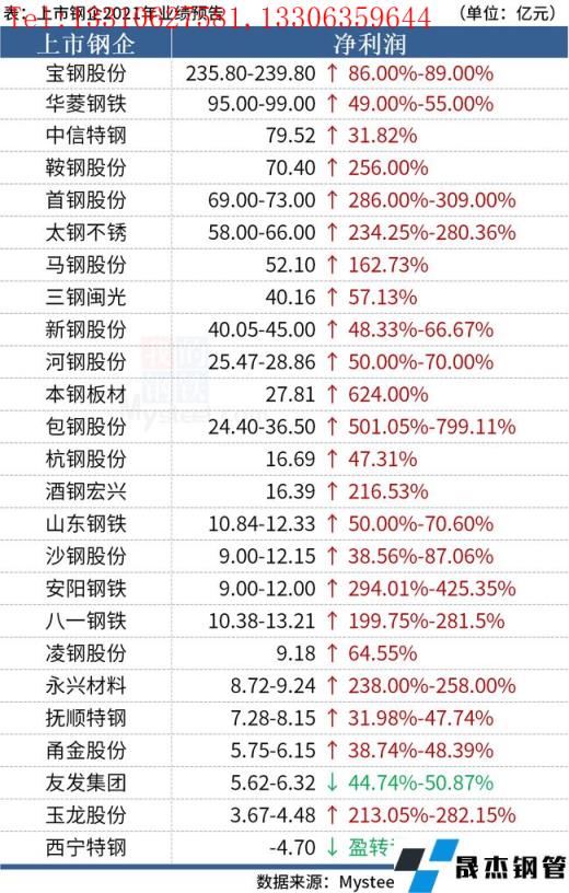 免責聲明:本網站(山東武鞍無縫鋼管廠www.97ks.net)刊載的“24家上市鋼企業績飄紅,9家實現凈利潤翻倍增長”等均源于網絡,版權歸原作者所有,且僅代表原作者觀點,本文所載信息僅供參考。轉載僅為學習與交流之目的,如無意中侵犯您的合法權益,請及時聯系刪除。本網站刊登此篇文章并不意味著本站贊同其觀點或證實其內容的真實性,我們不對其科學性、嚴肅性等作任何形式的保證。如果侵犯了您的版權,請盡快聯系我們予以撤銷,謝謝合作!