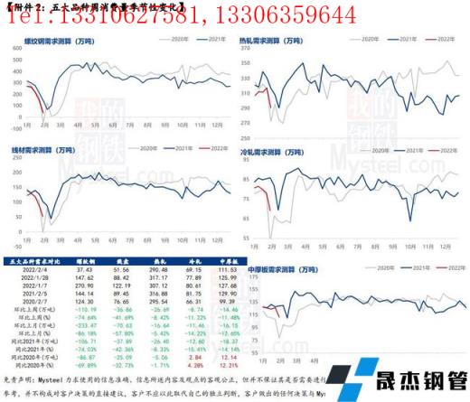 分品種來看,長板雙降,但板材降幅更加突出。從農歷同比來看,長材和板材分別同比低7.2%和11.8%。可見,板材在冬奧會限產和冬季采暖季限產期間影響較建材偏高。另外,由于建材品種受季節性影響較大,在節前已有大比例的減產,且集中于電爐和調坯企業,但節中部分長流程企業保持正常生產狀態,因此建材整體變化不大。而板材品種季節性表現并不突出,因此供應減量主因基本在于例檢和限產。綜合來看,因部分企業節后執行減限產計劃,后期仍有減量預期,但空間有限。