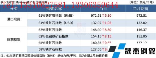 ◎ 1月31日-2月6日,中國47港鐵礦石到港總量2245.4萬噸,環比減少259.9萬噸;中國45港鐵礦石到港總量2183.7萬噸,環比減少225.1萬噸;北方六港鐵礦石到港總量為928.8萬噸,環比減少293.5萬噸。詳情>>