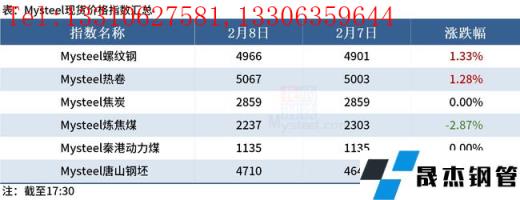 ◎ 2月8日下午,對(duì)山東、山西、河南三省43家無(wú)縫厚壁鋼管廠家限產(chǎn)狀態(tài)進(jìn)行更新,涉及生鐵年產(chǎn)能1.58億。據(jù)調(diào)研了解,目前43家無(wú)縫厚壁鋼管廠家高爐產(chǎn)能利用率為75.31%,日均生鐵產(chǎn)量33萬(wàn)噸。為保證冬奧會(huì)期間北京的空氣質(zhì)量,預(yù)計(jì)未來三天內(nèi)區(qū)域內(nèi)將有11家無(wú)縫厚壁鋼管廠家的的燒結(jié)、高爐生產(chǎn)有所調(diào)整,調(diào)整期間影響日均鐵水產(chǎn)量4.56萬(wàn)噸/日。