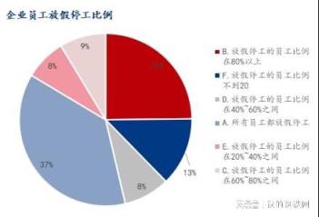 調研企業樣本中,放假停工的員工比例在20%~40%之間占比7.76%,放假停工的員工比例在40%~60%之間占比 8.65%;放假停工的員工比例在60%~80%之間占比8.65%;放假停工的員工比例不到20%占比12.86%;放假停工的員工比例在80%以上占比24.83%;所有員工都放假停工占比37.25%。