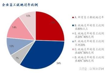 調研企業樣本中,所有員工都就地過年占比25.50%,就地過年的員工比例在80%以上占比33.70%,就地過年的員工比例在60%~80%之間占比13.75%,就地過年的員工比例在40%~60%之間占比9.76%,就地過年的員工比例在20%~40%之間占比7.10%,就地過年的員工比例不到20%占比10.20%。