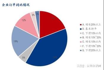 2、與去年同期相比,企業訂單增長的占比49.89%,持平的占比39.25%,下滑的占比10.86%。企業訂單情況增長的較多,形勢較為良好。