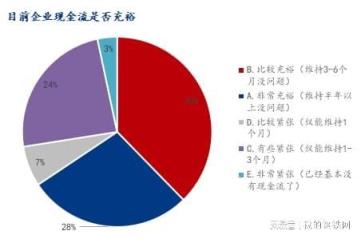目前企業的現金流是否充裕,參與調研企業中表示比較充裕(維持3-6個月沒問題)占比37.69%,非常充裕(維持半年以上沒問題)占比27.94%,比較緊張(僅能維持1個月)占比6.87%,有些緊張(僅能維持1-3個月)占比24.17%,非常緊張(已經基本沒有現金流了)占比3.33%。