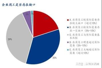 3、對比實際經營需要,54.32%企業表示在崗員工比實際需要存在缺口,39.02%企業表示在崗員工與實際需要基本匹配,僅有6.65%在崗員工超過實際需要。