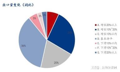 與去年同期相比,關于今年的出口量變化,在有出口業務的樣本中53.48%企業表示出口有增長,35.65%企業表示基本持平,10.87%企業出口下滑。具體來看增長20%以上占比6.96%,增長10%~20%占比26.52%,增長10%以內占比20.00%,基本持平占比35.65%,下滑10%以內占比5.22%,下滑10%~20%占比2.61%,下滑20%以上占比3.04%。