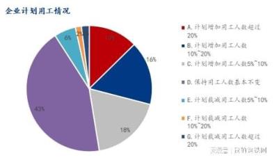 4、對于企業計劃用工情況,參與調研企業中47.45%企業計劃增加用工人數,43.46%企業保持基本不變,9.09%的企業計劃裁減用工人數。