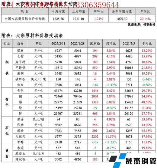 免責(zé)聲明:本網(wǎng)站(山東武鞍無(wú)縫鋼管廠www.97ks.net)刊載的“MRI:大宗原材料價(jià)格周報(bào)(2月7日-2月11日)”等均源于網(wǎng)絡(luò),版權(quán)歸原作者所有,且僅代表原作者觀點(diǎn),本文所載信息僅供參考。轉(zhuǎn)載僅為學(xué)習(xí)與交流之目的,如無(wú)意中侵犯您的合法權(quán)益,請(qǐng)及時(shí)聯(lián)系刪除。本網(wǎng)站刊登此篇文章并不意味著本站贊同其觀點(diǎn)或證實(shí)其內(nèi)容的真實(shí)性,我們不對(duì)其科學(xué)性、嚴(yán)肅性等作任何形式的保證。如果侵犯了您的版權(quán),請(qǐng)盡快聯(lián)系我們予以撤銷,謝謝合作!