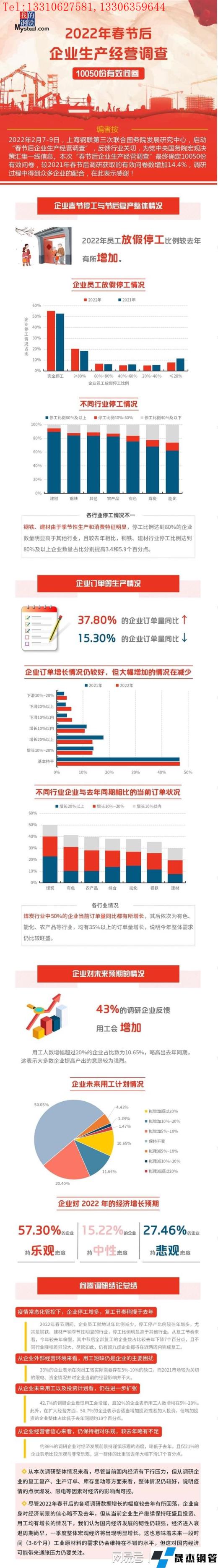 2022年2月7-9日,上海鋼聯(lián)第三次聯(lián)合國務(wù)院發(fā)展研究中心,啟動(dòng)“春節(jié)后企業(yè)生產(chǎn)經(jīng)營調(diào)查”,反饋行業(yè)關(guān)切,為黨中央國務(wù)院宏觀決策匯集一線信息。本次“春節(jié)后企業(yè)生產(chǎn)經(jīng)營調(diào)查”最終確定10050份有效問卷,較2021年春節(jié)后調(diào)研獲取的有效問卷數(shù)增加14.4%。 具體結(jié)論如下:
