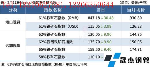 ◎ 2月17日,統(tǒng)計(jì)新口徑114家無(wú)縫厚壁鋼管廠家進(jìn)口燒結(jié)粉總庫(kù)存3427.74萬(wàn)噸,燒結(jié)粉總?cè)蘸?8.11萬(wàn)噸。原口徑64家無(wú)縫厚壁鋼管廠家進(jìn)口燒結(jié)粉總庫(kù)存1678.22萬(wàn)噸,燒結(jié)粉總?cè)蘸?2.64萬(wàn)噸,庫(kù)存消費(fèi)比39.4,燒結(jié)礦中平均使用進(jìn)口礦配比86.46%。
