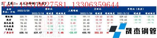 庫存方面,五大品種厚壁無縫鋼管總庫存春節(jié)后連續(xù)累增四周,環(huán)比上周增加94.94萬噸,增幅4.1%。分品種看,建材庫存增加105.78萬噸,增幅為6.9%;板材庫存減少10.84萬噸,降幅1.4%;分指標看,無縫厚壁鋼管廠家?guī)齑姝h(huán)比增加8.69萬噸,增幅1.4%;社會庫存環(huán)比增加86.25萬噸,增幅5.2%。