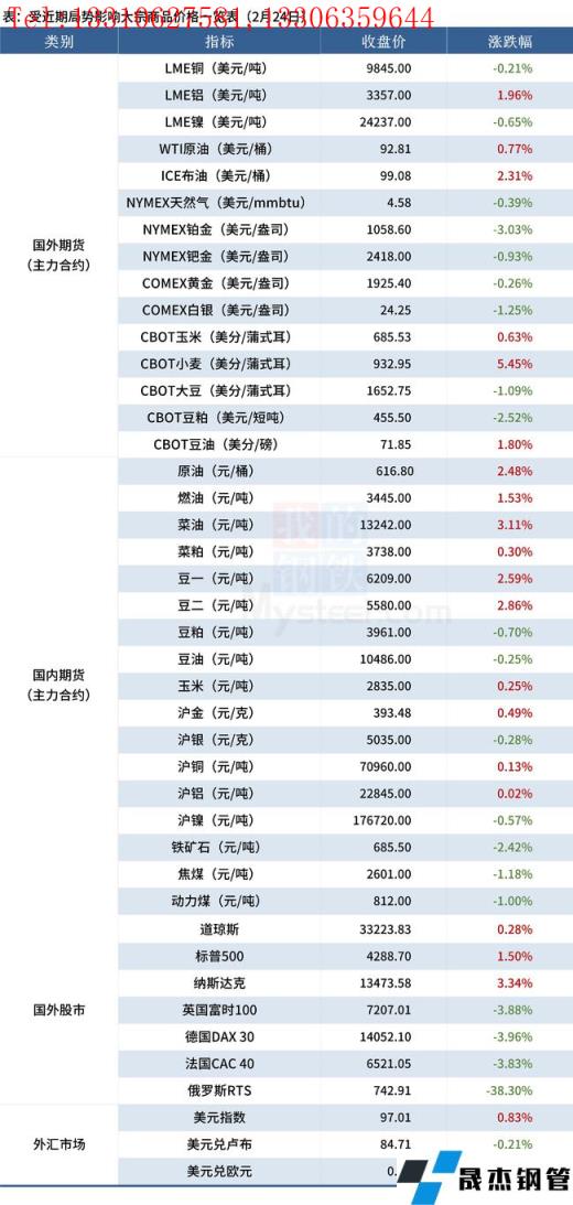 免責(zé)聲明:本網(wǎng)站(山東武鞍無縫鋼管廠www.97ks.net)刊載的“受近期局勢影響大宗商品價格一覽表(2月24日)”等均源于網(wǎng)絡(luò),版權(quán)歸原作者所有,且僅代表原作者觀點(diǎn),本文所載信息僅供參考。轉(zhuǎn)載僅為學(xué)習(xí)與交流之目的,如無意中侵犯您的合法權(quán)益,請及時聯(lián)系刪除。本網(wǎng)站刊登此篇文章并不意味著本站贊同其觀點(diǎn)或證實(shí)其內(nèi)容的真實(shí)性,我們不對其科學(xué)性、嚴(yán)肅性等作任何形式的保證。如果侵犯了您的版權(quán),請盡快聯(lián)系我們予以撤銷,謝謝合作!