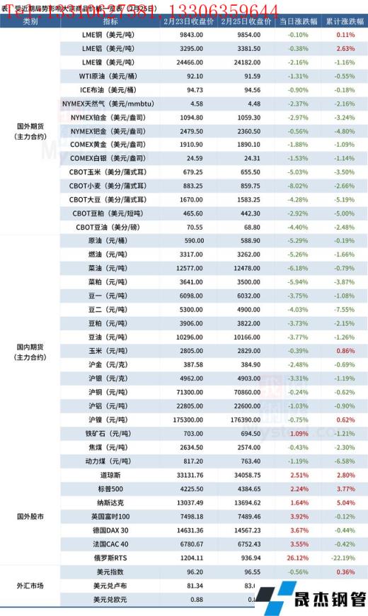 免責聲明:本網站(山東武鞍無縫鋼管廠www.97ks.net)刊載的“受近期局勢影響大宗商品價格一覽表(2月25日)”等均源于網絡,版權歸原作者所有,且僅代表原作者觀點,本文所載信息僅供參考。轉載僅為學習與交流之目的,如無意中侵犯您的合法權益,請及時聯系刪除。本網站刊登此篇文章并不意味著本站贊同其觀點或證實其內容的真實性,我們不對其科學性、嚴肅性等作任何形式的保證。如果侵犯了您的版權,請盡快聯系我們予以撤銷,謝謝合作!