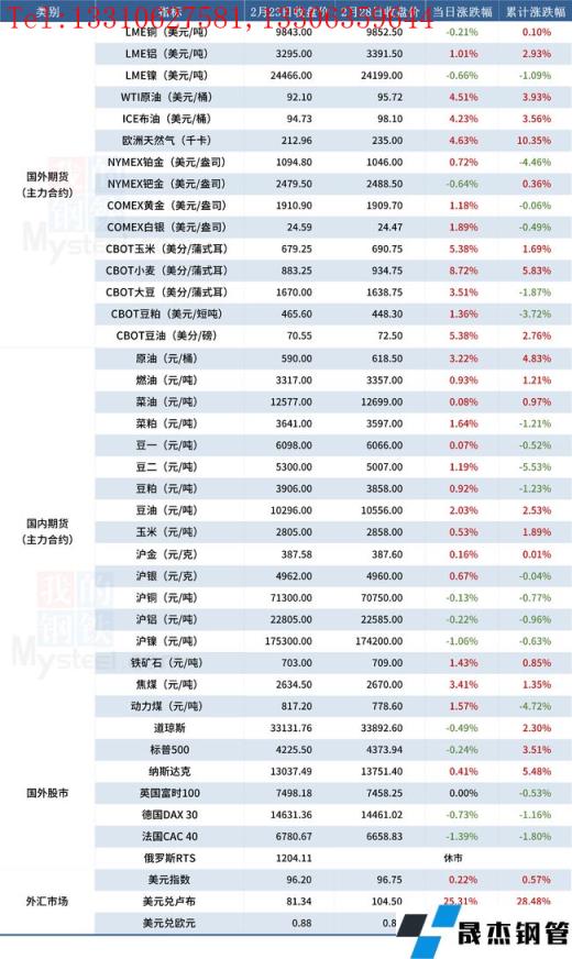 免責聲明:本網站(山東武鞍無縫鋼管廠www.97ks.net)刊載的“受近期局勢影響大宗商品價格一覽表(2月28日)”等均源于網絡,版權歸原作者所有,且僅代表原作者觀點,本文所載信息僅供參考。轉載僅為學習與交流之目的,如無意中侵犯您的合法權益,請及時聯系刪除。本網站刊登此篇文章并不意味著本站贊同其觀點或證實其內容的真實性,我們不對其科學性、嚴肅性等作任何形式的保證。如果侵犯了您的版權,請盡快聯系我們予以撤銷,謝謝合作!