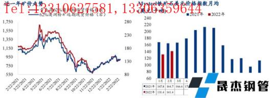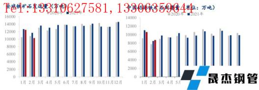 鐵礦石疏港:2月受限產限產影視,疏港大幅下降。截至2月25日,預計統計中國45港2月疏港量7364萬噸,日均疏港環比下降50.5萬噸/天至263萬噸/天,降幅16.1%。本月疏港降幅主要華北和華東地區,一方面是由于春節期間無縫厚壁鋼管廠家消化廠內庫存為主,提貨需求下降,另一方面是由于部分港口冬奧會期間有環保限運措施,無縫厚壁鋼管廠家提貨受阻導致。3月來看,隨著無縫厚壁鋼管廠家復產和限運限產得相對放松,疏港逐漸恢復提高,3月疏港或能恢復到300-305萬噸/天。