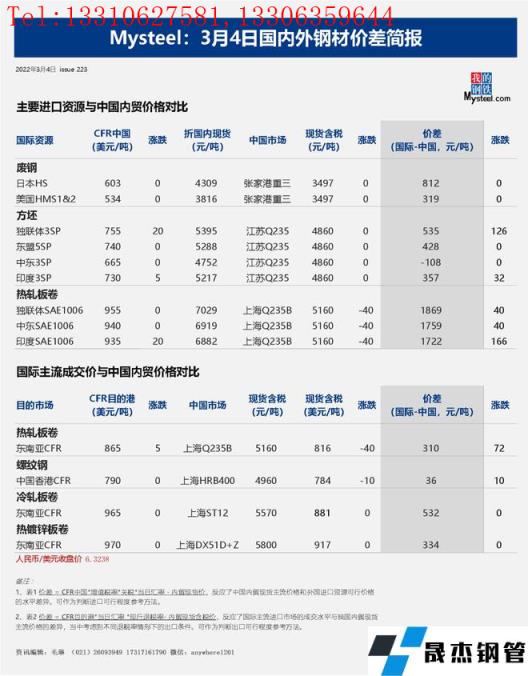 免責聲明:本網站(山東武鞍無縫鋼管廠www.97ks.net)刊載的“2022年03月04日日報:國內外鋼材_無縫鋼管價差匯總(2022.3.4)”等均源于網絡,版權歸原作者所有,且僅代表原作者觀點,本文所載信息僅供參考。轉載僅為學習與交流之目的,如無意中侵犯您的合法權益,請及時聯系刪除。本網站刊登此篇文章并不意味著本站贊同其觀點或證實其內容的真實性,我們不對其科學性、嚴肅性等作任何形式的保證。如果侵犯了您的版權,請盡快聯系我們予以撤銷,謝謝合作!