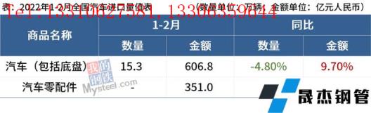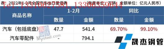 免責聲明:本網站(山東武鞍無縫鋼管廠www.97ks.net)刊載的“海關總署:1-2月中國出口汽車47.7萬輛,同比增99.10%”等均源于網絡,版權歸原作者所有,且僅代表原作者觀點,本文所載信息僅供參考。轉載僅為學習與交流之目的,如無意中侵犯您的合法權益,請及時聯系刪除。本網站刊登此篇文章并不意味著本站贊同其觀點或證實其內容的真實性,我們不對其科學性、嚴肅性等作任何形式的保證。如果侵犯了您的版權,請盡快聯系我們予以撤銷,謝謝合作!