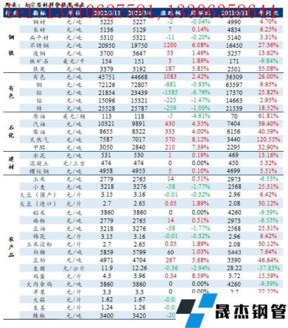 本周大宗商品價(jià)格漲跌互現(xiàn):其中厚壁無縫鋼管價(jià)格沖高回落,但均價(jià)高于上周;不銹鋼價(jià)格呈現(xiàn)先漲后跌的大幅波動(dòng)走勢(shì);有色金屬價(jià)格多數(shù)下跌;石化方面,本周國際原油價(jià)格高位震蕩,價(jià)格低于上周;成品油價(jià)格繼續(xù)上漲;LNG價(jià)格上漲;建筑材料方面,水泥價(jià)格小幅上漲,混凝土價(jià)格持穩(wěn)運(yùn)行,螺紋鋼價(jià)格沖高回落,小幅上漲;農(nóng)產(chǎn)品方面,農(nóng)產(chǎn)品價(jià)格漲跌互現(xiàn),主要產(chǎn)品中雞蛋、豆粕表現(xiàn)較為強(qiáng)勁,價(jià)格呈現(xiàn)一定幅度上漲,國內(nèi)豆油及生豬市場(chǎng)價(jià)格均偏弱下跌。