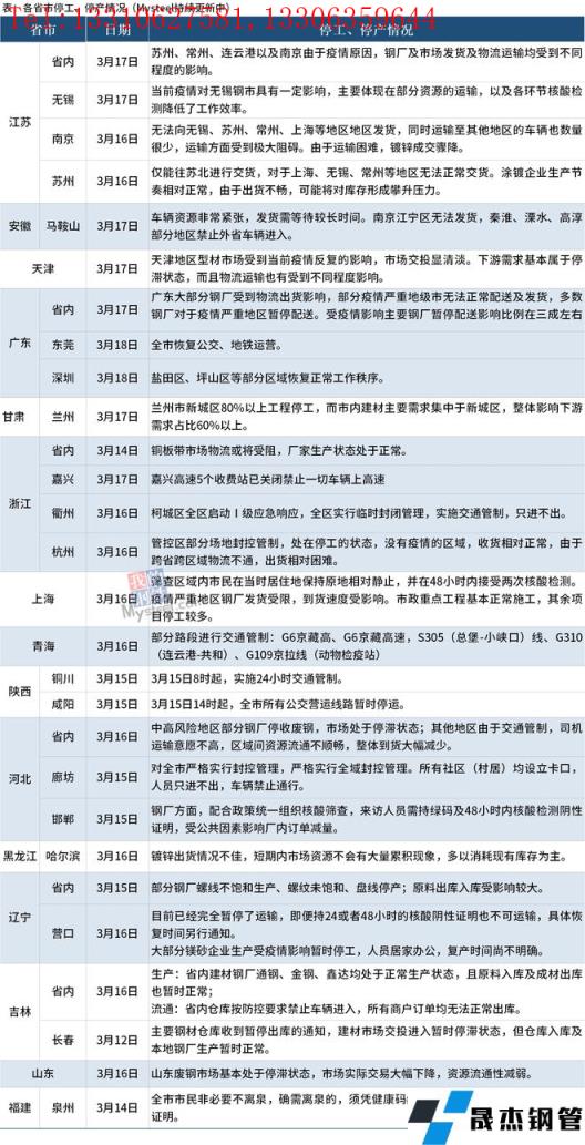 截至3月18日,匯總了15個省份停工停產(chǎn)最新信息。其中,江蘇省內(nèi)蘇州、常州、連云港以及南京由于疫情原因,無縫厚壁鋼管廠家及市場發(fā)貨及物流運輸均受到不同程度的影響。安徽省內(nèi)出現(xiàn)車輛資源非常緊張,發(fā)貨需等待較長時間等情況,無法向南京江寧區(qū)發(fā)貨,秦淮、溧水、高淳部分地區(qū)禁止外省車輛進入。廣東省大部分無縫厚壁鋼管廠家受到物流出貨影響,部分疫情嚴重地級市無法正常配送及發(fā)貨,多數(shù)無縫厚壁鋼管廠家對于疫情嚴重地區(qū)暫停配送。受疫情影響主要無縫厚壁鋼管廠家暫停配送影響比例在三成左右;東莞全市恢復公交、地鐵運營;深圳鹽田區(qū)、坪山區(qū)等部分區(qū)域恢復正常工作秩序。具體情況如下: