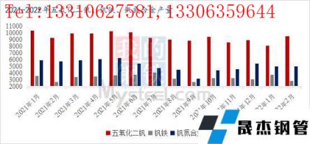 21年受國內(nèi)政策影響,五氧化二釩1-6月產(chǎn)量6.5萬噸,7-10月5.39萬噸,高出下半年20.6%;釩鐵1-6月產(chǎn)量2.06萬噸,7-10月1.94萬噸,高出下半年6.2%;釩氮合金1-6月3.54萬噸,7-10月2.68萬噸,高出下半年32%。2022年1-2月各類釩產(chǎn)品產(chǎn)量相對去年同期略有所減少,加之當(dāng)前國際形勢及馬上臨近下游基建建筑生產(chǎn)高峰,需求會相對增加,在利潤可觀的情況下,釩企生產(chǎn)高峰時(shí)段有望出現(xiàn)在上半年。