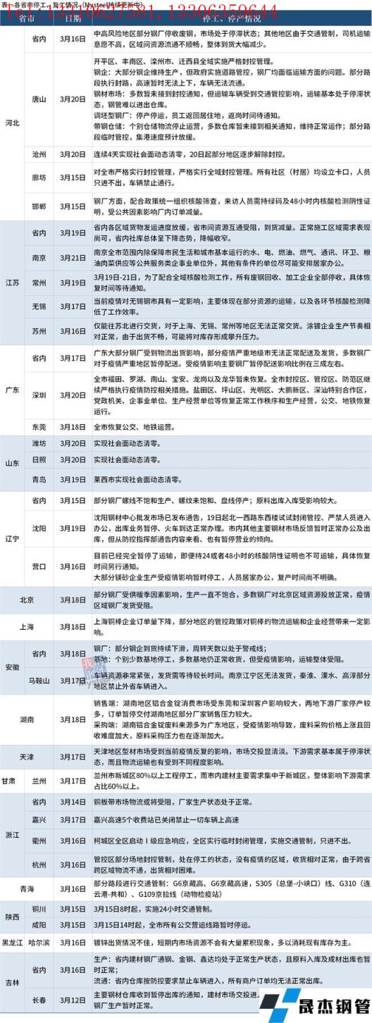 截至3月21日,匯總了16個省份停工停產(chǎn)最新信息。其中,3月21日,南京全市范圍內(nèi)除保障市民生活和城市基本運(yùn)行的水、電、燃油、燃?xì)狻⑼ㄓ?、環(huán)衛(wèi)、糧油肉菜供應(yīng)等公共服務(wù)類企事業(yè)單位外,其他有條件的單位盡可能安排居家辦公。3 月20日,唐山開平區(qū)、豐南區(qū)、灤州市、遷西縣全域?qū)嵤﹪?yán)格封控管理;大部分鋼企維持生產(chǎn),但政府實(shí)施道路管控,無縫厚壁鋼管廠家均面臨運(yùn)輸方面的問題。深圳全市福田、羅湖、南山、寶安、龍崗以及龍華暫未恢復(fù),全市封控區(qū)、管控區(qū)、防范區(qū)繼續(xù)嚴(yán)格執(zhí)行疫情防控相關(guān)措施。山東濰坊日照、青島萊西市實(shí)現(xiàn)社會面動態(tài)清零。河北滄州連續(xù)4天實(shí)現(xiàn)社會面動態(tài)清零,3月20日起部分地區(qū)逐步解除封控。具體情況如下: