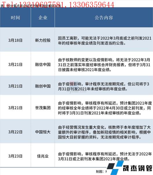 與往年相比,今年房企披露業(yè)績(jī)呈扎堆發(fā)布的特點(diǎn),多集中在3月29日-31日。除此之外,截至3月24日,據(jù)不完全統(tǒng)計(jì),已有6家重點(diǎn)房企發(fā)布公告稱將延遲刊發(fā)2021年度業(yè)績(jī)報(bào)告,公告顯示延遲原因多為疫情影響,具體情況如下: