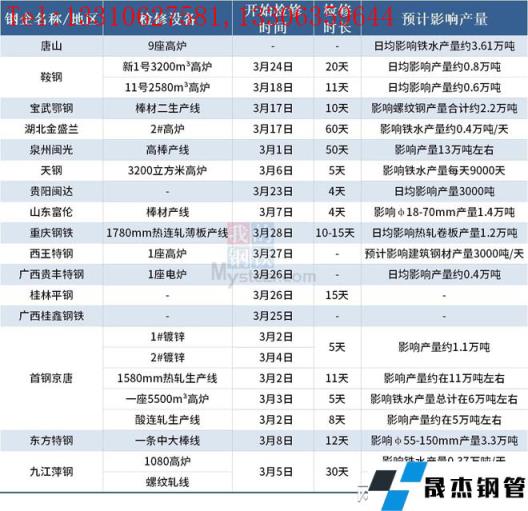 據(jù)不完全統(tǒng)計(jì),截至3月28日超20家無縫厚壁鋼管廠家發(fā)布檢修計(jì)劃。其中,檢修時(shí)間最長的是湖北金盛蘭,計(jì)劃自3月17日對2#高爐進(jìn)行檢修兩個(gè)月,預(yù)計(jì)影響鐵水產(chǎn)量約0.4萬噸/天,復(fù)產(chǎn)時(shí)間5月16日。