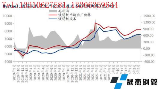 對民營企業成本&利潤測算數據顯示:2022年4月份鍍錫板生產成本7576.51元/噸,月環比增加48.2元/噸;毛利583.49元/噸,月環比下降68.2元/噸,同比下滑284.27元/噸,全流程企業整體利潤尚可。4月基板結算成本增加、疫情影響下,運輸成本上漲明顯,錫錠成本窄幅回調,鍍錫板出廠價格挺價意愿偏弱。