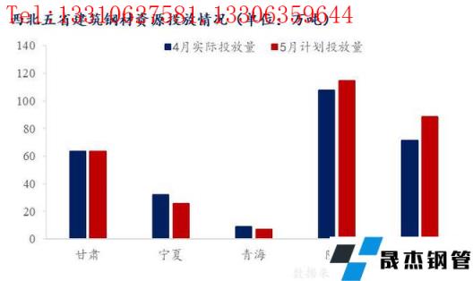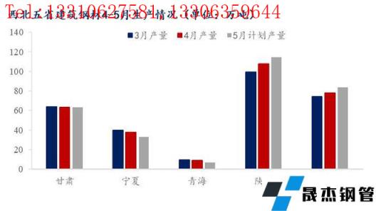 5月西北區(qū)域無(wú)縫厚壁鋼管廠(chǎng)家計(jì)劃總產(chǎn)量約為301.64萬(wàn)噸,較4月實(shí)際產(chǎn)量增加6.3萬(wàn)噸左右,其中陜西和新疆分別增加7.2萬(wàn)噸和6.6萬(wàn)噸,甘肅無(wú)明顯變化,青海和寧夏略有減量。