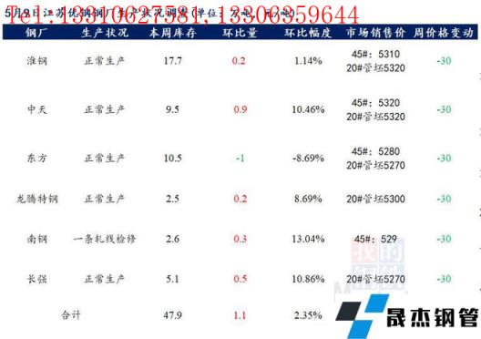 江蘇優特無縫厚壁鋼管廠家棒材總庫存47.9萬噸,較上周增加1.1萬噸,環比增2.35%,較去年同期上升10.48萬噸,同比增28.01%。