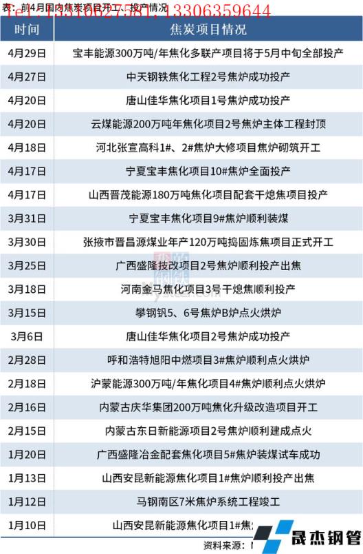 據(jù)不完全整理,2022年前4月國(guó)內(nèi)有21個(gè)焦炭項(xiàng)目開(kāi)工、投產(chǎn)。其中,河北張宣高科、張掖市晉昌源煤業(yè)和內(nèi)蒙古慶華集團(tuán)等焦炭相關(guān)項(xiàng)目開(kāi)工;寶豐能源、中天鋼鐵、山西晉茂能源和河南金馬等焦炭項(xiàng)目投產(chǎn)。具體內(nèi)容如下: