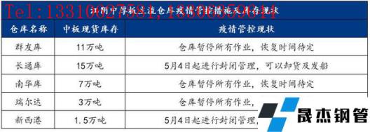 5月4日,江陰疫情爆發(fā),本地中厚板主流倉(cāng)庫(kù)群友庫(kù)、南華庫(kù)、瑞爾達(dá)庫(kù)全部暫停所有作業(yè),卸貨、提貨均停止,涉及中板庫(kù)存量21萬(wàn)噸。長(zhǎng)通庫(kù)、新西港施行封閉管理,碼頭可以卸貨及發(fā)船,汽運(yùn)停止,涉及中板庫(kù)存量16.5萬(wàn)噸。此輪疫情管控,使得江陰本地40萬(wàn)噸現(xiàn)貨中板庫(kù)存將近一半成為死庫(kù)存,另外一半流通性也大大減弱,具體明細(xì)如下: