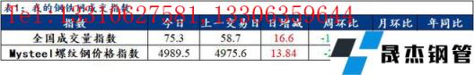 訊:全國建筑厚壁無縫鋼管成交量監測,成交量相對指數來看,全國75.3增16.6,北方69.7增23.4,華東98增18.6,南方55.7增11。今日螺紋鋼價格指數4989.5,較上一交易日增13.84。