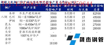 根據初步減限產方案,八鋼本部4座高爐全開,但不生產建筑厚壁無縫鋼管,預計影響建筑厚壁無縫鋼管產量5500噸/日,巴州和伊鋼基地各燜一座高爐,預計影響建筑厚壁無縫鋼管產量分別為3000噸/日和2000噸/日;昆玉燜一座高爐,預計影響建筑厚壁無縫鋼管產量1800噸/日;昆侖和閩新無縫厚壁鋼管廠家建筑厚壁無縫鋼管停產十天,預計分別影響建筑厚壁無縫鋼管產量2800噸/日和3000噸/日;大安鋼鐵資源暫不投往新疆區域;金特待定。