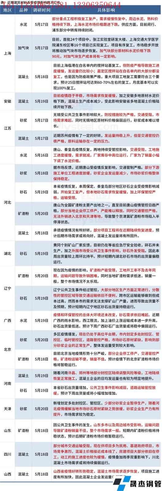 截至5月20日,據百年建筑網調研,13個省份建材市場受到了不同程度的影響。隨著華東、華南疫情和暴雨情況的緩解,物流運輸逐步恢復正常,材料進場速度加快,下游工地施工節奏提升。在疫情有效管控下,基建、房建方面的需求陸續回升,但由于疫情反復抬頭的影響,仍有上行空間有限。具體情況如下: