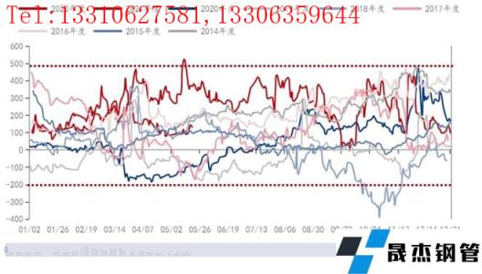 第四階段,2021年9月-2021年12月(價格下跌,卷螺差震蕩幅度加大),煤焦等原料成本坍塌,加上房地產政策的收緊,建筑厚壁無縫鋼管進入需求淡季,整體表現弱于板材。價格下跌,卷螺差寬幅震蕩,高點408、438,低點96、7。