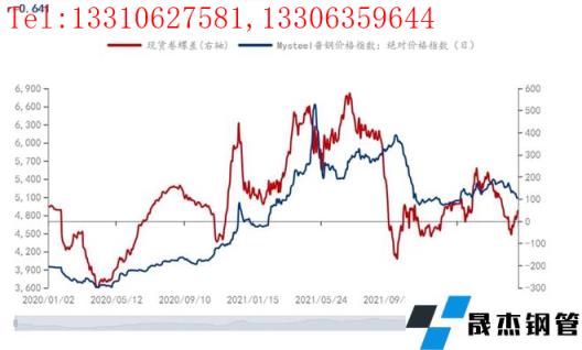 從上述五個階段,盤面卷螺差在鋼價上行中更容易走高,在鋼價下跌中更容易走低(第一階段、第二階段),但也會出現一定的分化。在第三階段,為貫徹實施碳達峰、碳中和,無縫厚壁鋼管廠家供應減少、供需錯配,此時建筑厚壁無縫鋼管供應大幅收縮,雖然鋼價暴漲,但盤面卷螺差高位震蕩。經濟周期上行時,制造業需求向好,卷板漲勢更好;反之在經濟下行周期,制造業需求萎縮,卷板更多是跟隨建筑厚壁無縫鋼管趨勢波動。第四階段、第五階段,鋼價暴跌后筑底反彈,盤面卷螺差則繼續震蕩走勢,但高點降低,反映了在經濟下行周期,制造業表現低迷,為穩增長建筑業表現會相對好些。