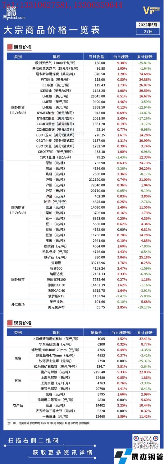 免責聲明:本網站(山東武鞍無縫鋼管廠www.97ks.net)刊載的“俄烏局勢丨大宗商品價格一覽表(5月27日)”等均源于網絡,版權歸原作者所有,且僅代表原作者觀點,本文所載信息僅供參考。轉載僅為學習與交流之目的,如無意中侵犯您的合法權益,請及時聯系刪除。本網站刊登此篇文章并不意味著本站贊同其觀點或證實其內容的真實性,我們不對其科學性、嚴肅性等作任何形式的保證。如果侵犯了您的版權,請盡快聯系我們予以撤銷,謝謝合作!