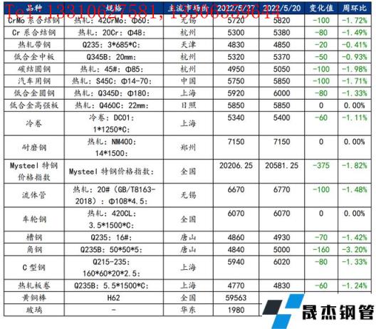截止2022年5月27日,各原材料當日即時價格以及價格周環(huán)比情況如下:
