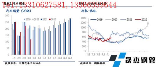 汽車行業(yè)作為我國厚壁無縫鋼管消費(fèi)重要的下游行業(yè),其厚壁無縫鋼管用量約占汽車總重量的70%左右。整車制造過程中,轎車單車厚壁無縫鋼管耗量1噸左右,其中,冷軋是汽車厚壁無縫鋼管消費(fèi)“主力”,約占汽車厚壁無縫鋼管消費(fèi)的30%,未來汽車需求增量將直接影響冷軋價(jià)格走勢。一般而言,汽車產(chǎn)銷旺季在下半年開啟,尤其在第四季度達(dá)到頂峰,隨著汽車消費(fèi)回升,冷熱價(jià)差呈現(xiàn)規(guī)律性擴(kuò)大。2022年以來,受疫情影響,汽車生產(chǎn)和消費(fèi)受到抑制,尤其是4月份,國內(nèi)汽車銷量同比、環(huán)比降幅均超過40%。本次汽車購置稅減半政策力度大,涉及范圍廣,對刺激市場消費(fèi)、提振消費(fèi)者信心起到重要作用,預(yù)計(jì)下半年汽車產(chǎn)銷將得到有力回補(bǔ),7-8月汽車產(chǎn)銷或呈現(xiàn)“淡季不淡”的特征,冷軋價(jià)格將得到提振,預(yù)計(jì)下半年冷熱價(jià)差或長期居于高位。